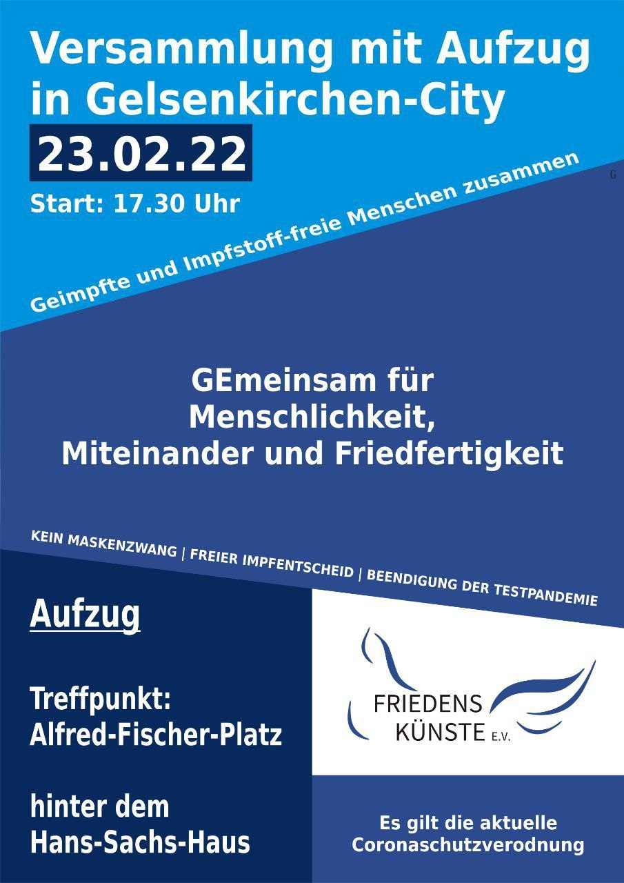 Am Mittwoch, dem 23.2.2022, finden in Gelsenkirchen zwei Demonstrationen statt. Eine Demo findet seit Wochen jeden Mittwoch am HANS-SACHS-HAUS statt, und richtet sich gegen die CORONA-Maßnahmen und die bereits beschlossene, und noch drohende Impfpflicht (ZWANGSIMPFUNG).