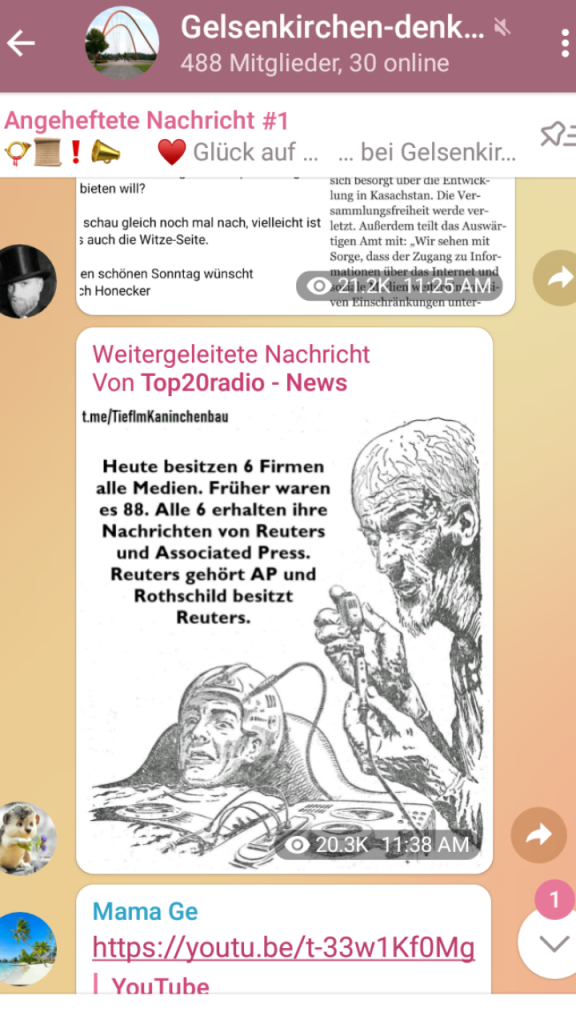 Gemeint war die Gruppe von GELSENKIRCHEN DENKT ANDERS. Unter Antisemitismus verstehen die diese weitergeleitete Grafik. Alleine die Nennung des Namens ROTHSCHILD ist für solche Antisemitismus-Förderer also schon Antisemitismus. Vermutlich macht man das, weil man sich für unheimlich wichtig halten will.