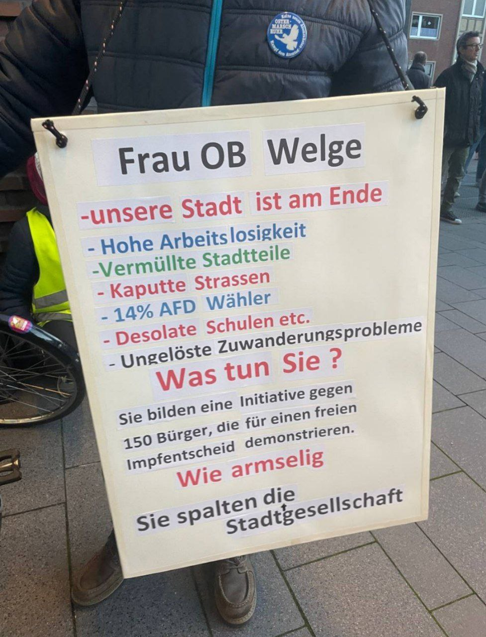 Während die Corona-Kritiker und Zwangsimpfgegner gegen Maßnahmen auf die Straßen gehen, wurden die Teilnehmer der Gegendemo von der Stadt aufgestachelt gegen Menschen auf die Straße zu gehen, und diese als Antisemiten, Corona-Leugner, Faschisten, Rechtsradikale, Reichsdeutsche, Verschwörungstheoretiker und ähnliches zu verleumden.